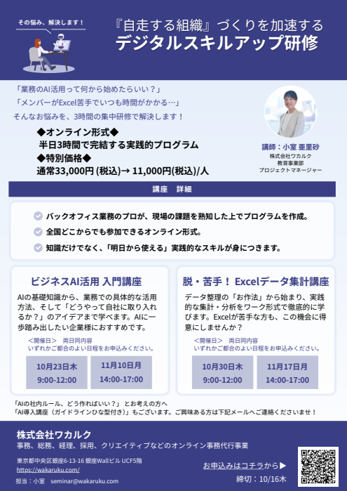 株式会社ワカルクは、企業の皆様向けに「デジタルスキルアップ研修」を開催いたします。